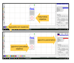 Svarbi dokumento dalis skirta spalvų naudojimui. Programoje skirtingos spalvos žymi skirtingus lazerio veiksmus: mėlyna dažniausiai naudojama graviravimui, raudona – įpjovimui, o juoda – pilnam pjovimui. Šios spalvos nėra griežtai fiksuotos, todėl naudotojas gali jas priskirti pagal savo poreikius, nustatydamas kiekvienai spalvai konkrečius parametrus, tokius kaip galia ir greitis. Tai leidžia viename makete patogiai valdyti skirtingus pjovimo etapus.